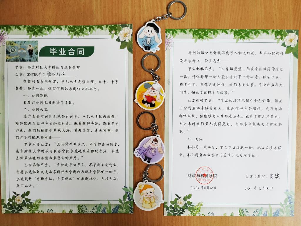 “毕业季”的仙林,空气中弥漫着不舍,财政与税务学院也为即将远行的学子们准备了一系列别出心裁的礼物。签署专属毕业合同、定制印花税票、学院吉祥物“财小税”定制版钥匙扣陪伴毕业生们度过以后的春夏秋冬。