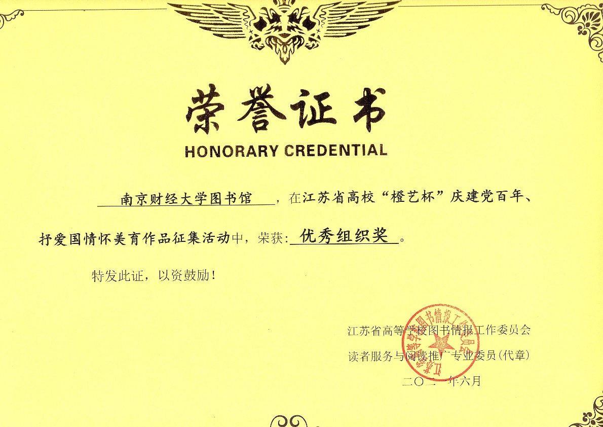 为庆祝建党100周年,近日,由江苏省高等学校图书情报工作委员会读者服务与阅读推广专业委员会主办、南京艺术学院图书馆承办的江苏省高校“橙艺杯”庆建党百年、抒爱国情怀美育作品成果征集活动评选结果揭晓。金年会艺术设计学院动画1901班伍文杰同学获得“最具匠心奖”,环境2001班王康文同学获得“橙艺创意奖”,金年会图书馆获得“优秀组织奖”。