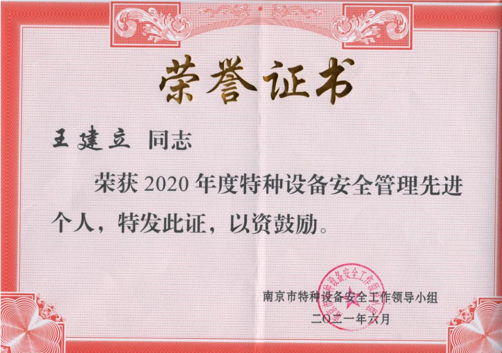 近日,南京市特种设备安全工作领导小组办公室印发《关于表彰2020年度特种设备安全管理先进集体和先进个人的决定》(宁特安办[2021]2号),金年会国资处副处长王建立同志被评为“2020年度南京市特种设备安全管理先进个人”称号。