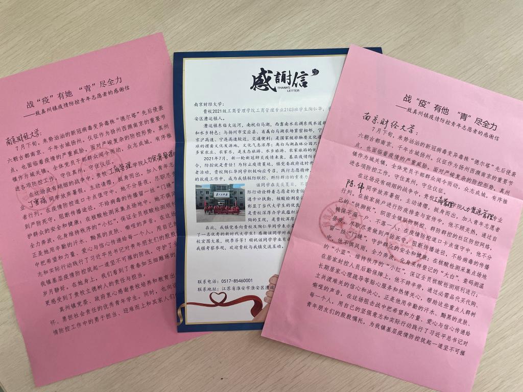 近日,工商管理学院陆续收到来自江苏扬州、淮安等地社区、村委会、街道办给予学院学生的表扬信。信中分别对假期积极投身当地疫情防控工作的同学们提出表扬,表扬金年会学子的责任担当,感谢他们的义无反顾。