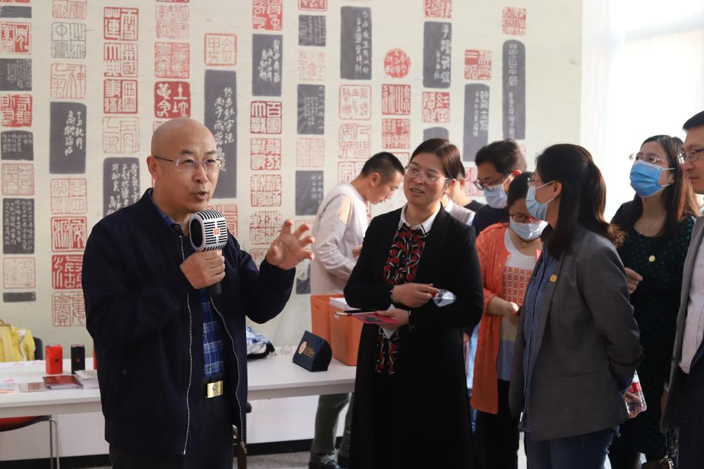 学员们在参观校美术馆的过程中,对金年会美术馆的建设和布局产生了浓厚的兴趣,尤其是仔细聆听了仇高驰馆长的介绍后,对篆刻文化有了更深刻的认识,纷纷对金年会师生以篆刻展献礼建党百年的形式表示赞赏。