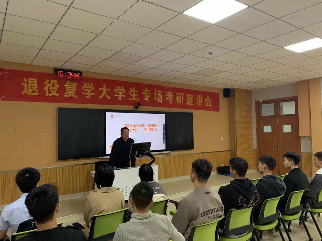11月13日下午,金年会迷彩协会在仙林校区博文楼103教室举办退役复学大学生专场考研宣讲会。研究生院副院长华凌志、人民武装部副部长潘雪峰及部分退役复学大学生参加宣讲会。
