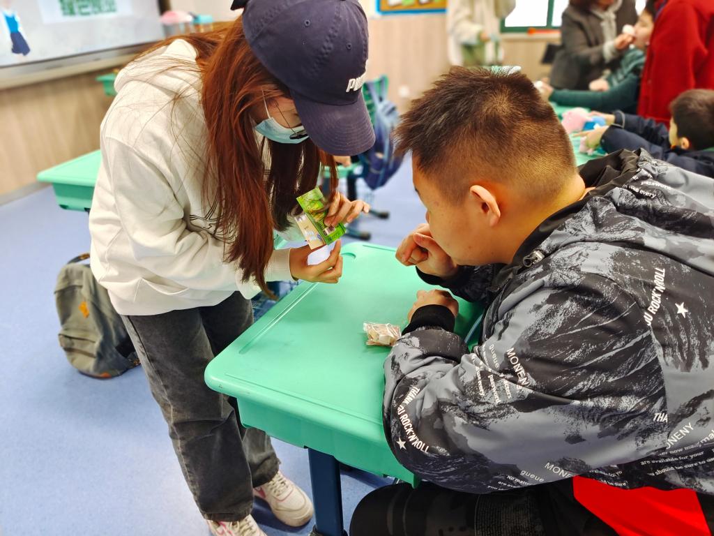 志愿者分六个小组为不同的班级进行授课。活动开始,主持人向小朋友们介绍了世界儿童日的背景,讲述了食品安全的相关知识。在实物和卡片展示环节,通过对比食品腐败前后的变化,志愿者们教小朋友们判断食品是否变质,带领小朋友们寻找食品包装上的保质期和生产日期,通过这样的方式去快速辨别食品是否还能食用。