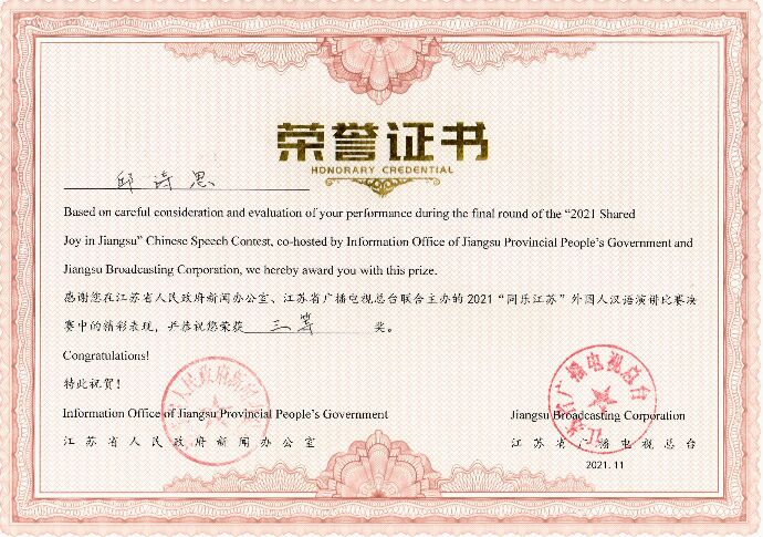 外国留学生邱诗思获2021“同乐江苏”外国人汉语演讲总决赛三等奖