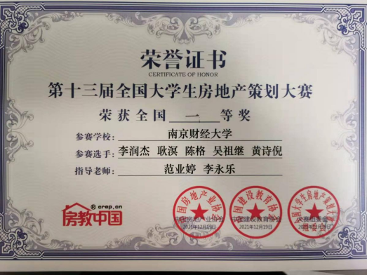 12月12日,在第十三届全国大学生房地产策划大赛全国总决赛中,公共管理学院房地产开发与管理专业“欢迎光陵”队(成员:李润杰、耿溟、陈格、吴祖继、黄诗倪,指导教师:范业婷、李永乐)以华东区域第1名的成绩突出重围,挺进全国冠军赛。