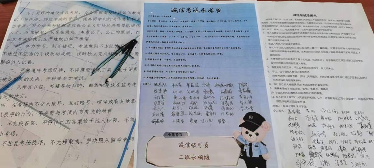 党委学生工作部一直将诚信考试教育作为学风建设长效机制形成的重要环节,不仅力求对学生起到警示和约束作用,更注重锻造其自律自强意识和艰苦奋斗精神,鼓励学生不仅要答好考试试卷,更要答好人生答卷,努力在全校营造公平公正、诚信规范的考试氛围。