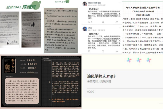 同学们积极响应阅读号召,纷纷加入到云端共读中,在云端阅览室里晒出阅读打卡记录和读书心得。“通过参与云端阅览室的读书打卡活动,我坚持每天阅读书籍。独自看书,一本书很快就读完了,但却少了很多理解与感悟。但是一群人分享着阅读就不同了,分享的时候能够激发我更多的读书灵感,让我得到更多的感悟与启发。”财税2105班张宇欣同学说。