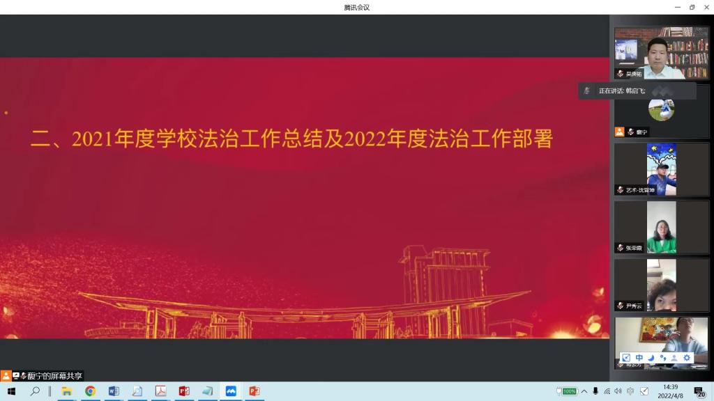改革发展办公室副主任韩启飞汇报了2021年度学校法治工作情况及2022年度法治工作计划。2021年,学校坚持以习近平新时代中国特色社会主义思想为指导,坚持党对全民普法工作的领导,贯彻落实党中央决策部署,实现学校治理体系和治理能力现代化。各相关部门坚持围绕中心、服务大局,扎实开展基层依法治理工作,学校依法治理水平显著提升。2022年是深入实施“八五”普法规划的关键之年,学校将以习近平新时代中国特色社会主义思想为指导,结合学校工作实际,全面落实《金年会jinnianhuicom2022年度推进依法治校实施方案》,进一步推进依法治校工作。