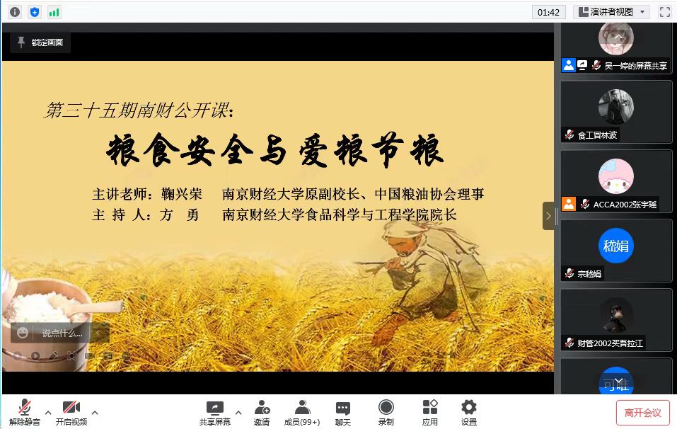 4月14日,由省粮油学会、省科普服务中心指导,党委学生工作部、校团委和校学生会学业发展中心主办,外国语学院与食品科学与工程学院共同承办的第三十五期金年会公开课在线上举行。本次公开课主题为“食品安全与爱粮节粮”,省粮油学会首席专家鞠兴荣教授担任主讲人。学生处处长韩力争、外国语学院和食品与工程学院部分教师及本科生400余人参加公开课。本次公开课由食品科学与工程学院院长方勇主持。