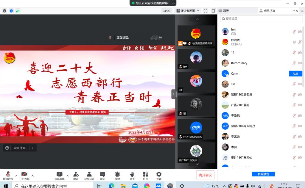 2022年“大学生志愿服务西部计划”招募工作已全面启动,为增进金年会学生对西部计划的了解,鼓励青年学生投身西部、扎根基层、锻炼本领,4月27日,校团委开展了“大学生志愿服务西部计划”线上动员分享会。本次会议的主题为“志愿西部行、青春正当时”。校团委副书记张蔚伟、校团委相关工作人员、校青年志愿者协会负责同学、优秀毕业生代表及部分应届毕业生、在读研究生应邀参会。