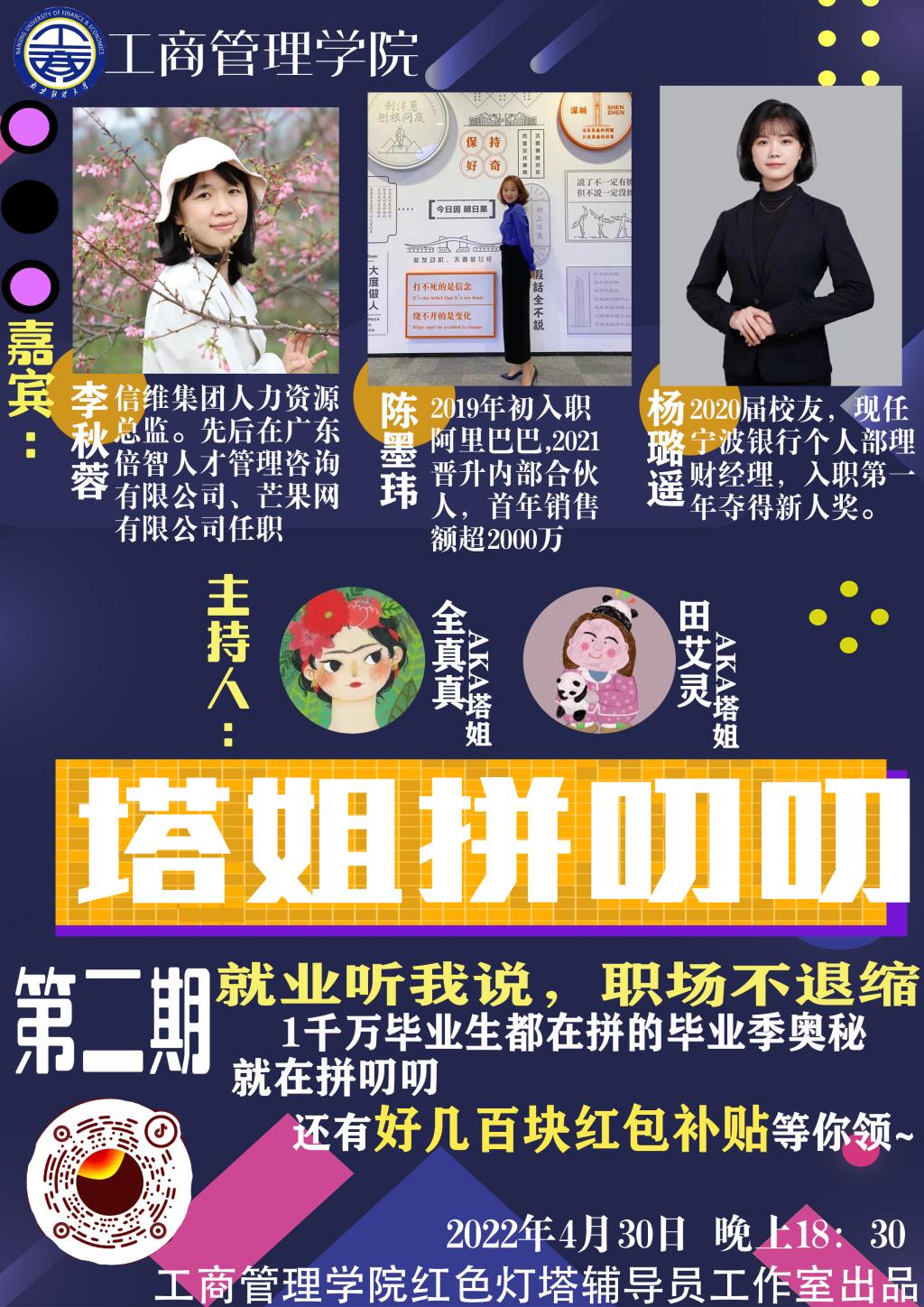 为服务学生成长成才,工商管理学院红色灯塔辅导员工作室在抖音开设了“塔姐拼叨叨”系列直播活动。近日,结合毕业季,以“就业听我说,职场不退缩”为主题的直播如约而至,直播邀请了信维集团人力资源总监、金年会2009届校友李秋蓉,阿里巴巴内部合伙人、金年会2018届校友陈墨玮,以及宁波银行个人部理财经理、金年会2020届校友杨璐遥作为嘉宾。直播由工商管理学院党委副书记全真真和18级辅导员田艾灵主持。学院18、19级全体同学观看直播。