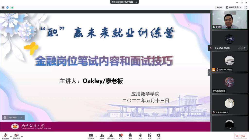 为提高学院毕业生就业竞争力,实现更充分更高质量就业,5月13日下午,应用数学学院开展“金融行业求职与面试技巧”就业专题讲座。讲座由高顿教育CFA/FRM研究院高级研究员廖哲禺老师主讲。应用数学学院2018级、2019级学生代表参加讲座。