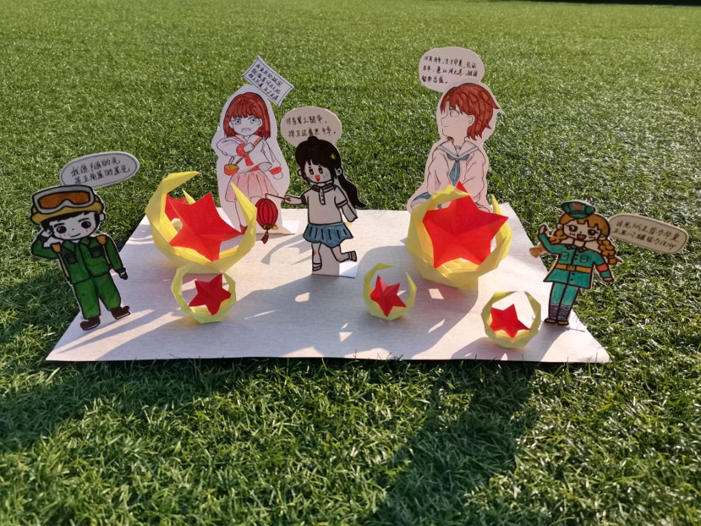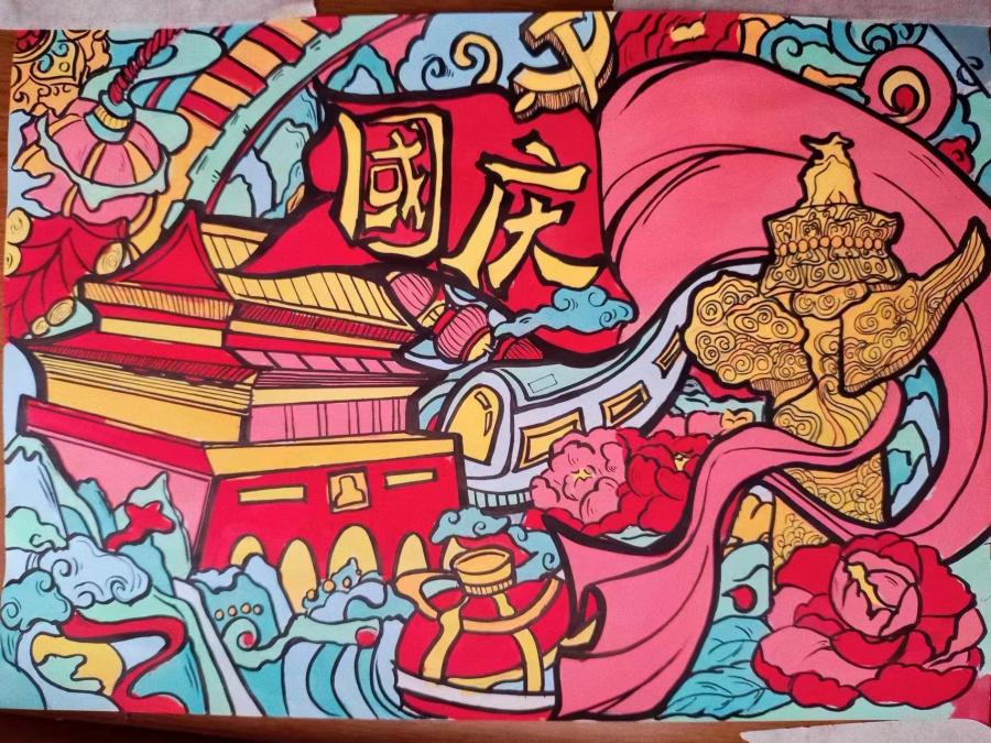 妙笔生花绘祝福。鲜艳的五星红旗、天安门、“中国雄师”……艺术设计学院的同学们将心中的国家元素通过手中的画笔展现出来。“我在画中使用了大量红色:五星红旗、天安门是国家的象征,红灯笼寓意红红火火;绿色和蓝色既可以调节画面氛围,又展现了祖国山河风采,体现了‘绿水青山就是金山银山’的理念。”环境设计2202班梁栋同学如此阐释他画作中的“深意”。营销与物流管理学院学生通过三行情诗献祖国、制作祖国骄傲时刻墙、手工制作国旗等方式,表达对祖国的热爱。学生处开展“制国旗话使命”本科班长训练营活动,学生处相关老师与本科生班长代表一起交流班级建设工作,制作国旗,喜迎国庆。公共管理学院开展了“用青春‘拼’出中国——我与国旗贴贴”活动。在精心装扮的学院耕读园一角,新生们挥舞着手摇国旗,举着祝福手牌,与国旗合照。新生们与国旗的合影拼成偌大的“中国”二字,表达对祖国的无限热爱。