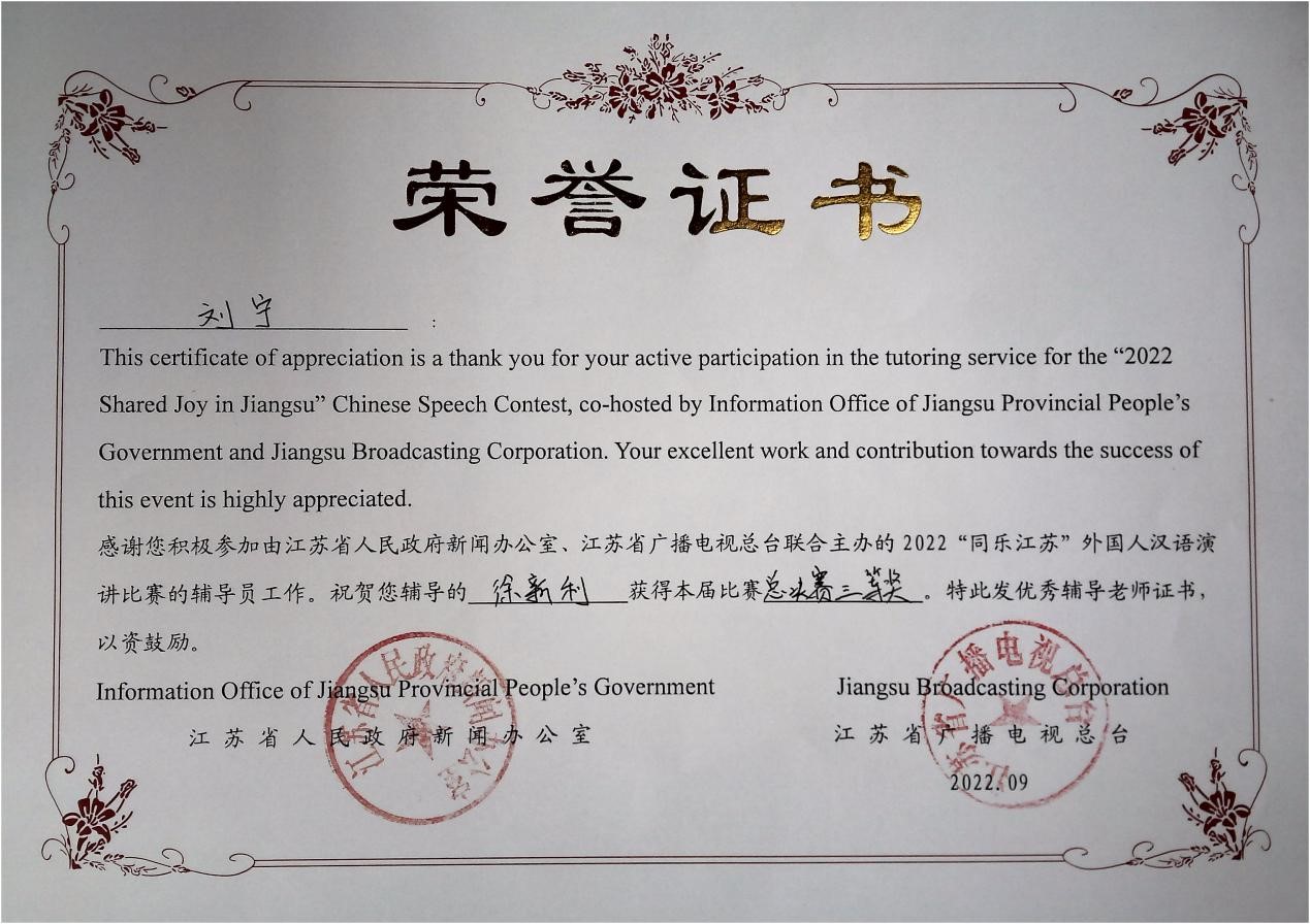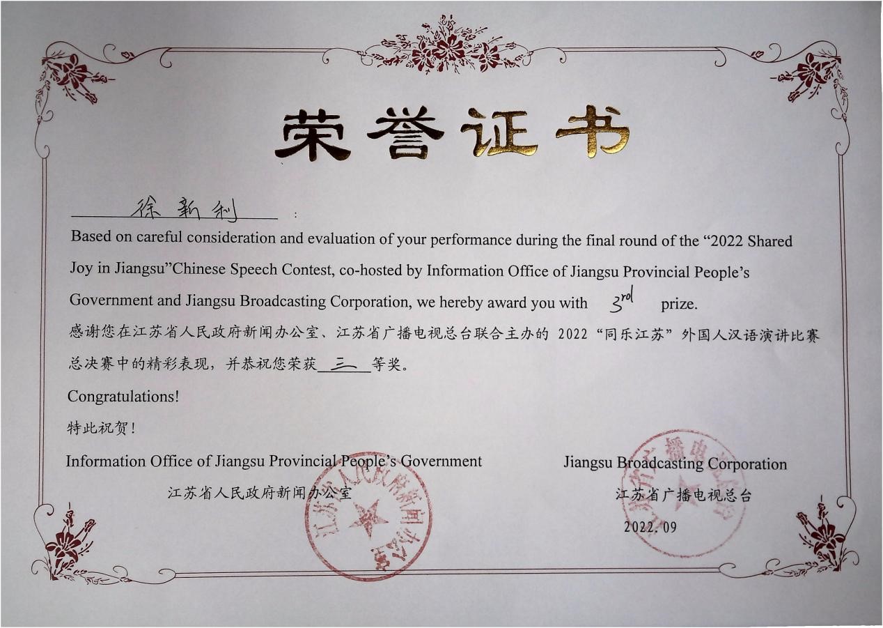 近日,由江苏省人民政府新闻办公室、江苏省人民政府外事办公室、江苏省教育厅等单位共同主办,江苏省广播电视总台承办的2022“同乐江苏”外国人汉语演讲比赛圆满结束。经过激烈角逐,金年会外国留学生CHEEWARUNGROD THEPPANADDA(徐新利)获得总决赛三等奖,国际教育学院刘宁老师获优秀辅导教师奖。