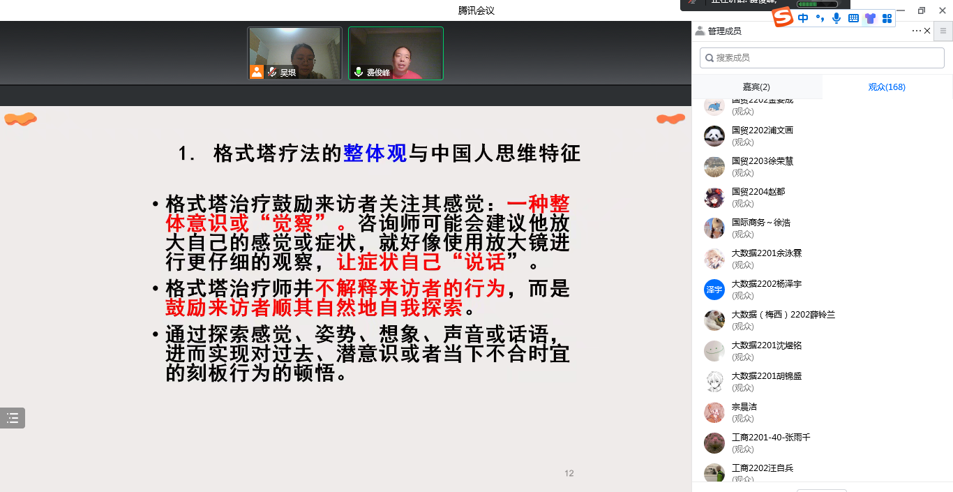 为提升全校2022级新生心理委员心理素养和助人能力,11月2日至14日,学生处心理健康教育与咨询中心开展心理委员工作能力提升系列培训,南京大学教育学院、学校心理教育研究所所长费俊峰副教授应邀线上开展主题为“格式塔心理学在心理委员工作中的应用”的培训,南京师范大学心理中心主任向莉莉老师应邀作“大学生常见心理问题的识别与干预”专题培训。金年会2022级新生心理委员参加讲座。
