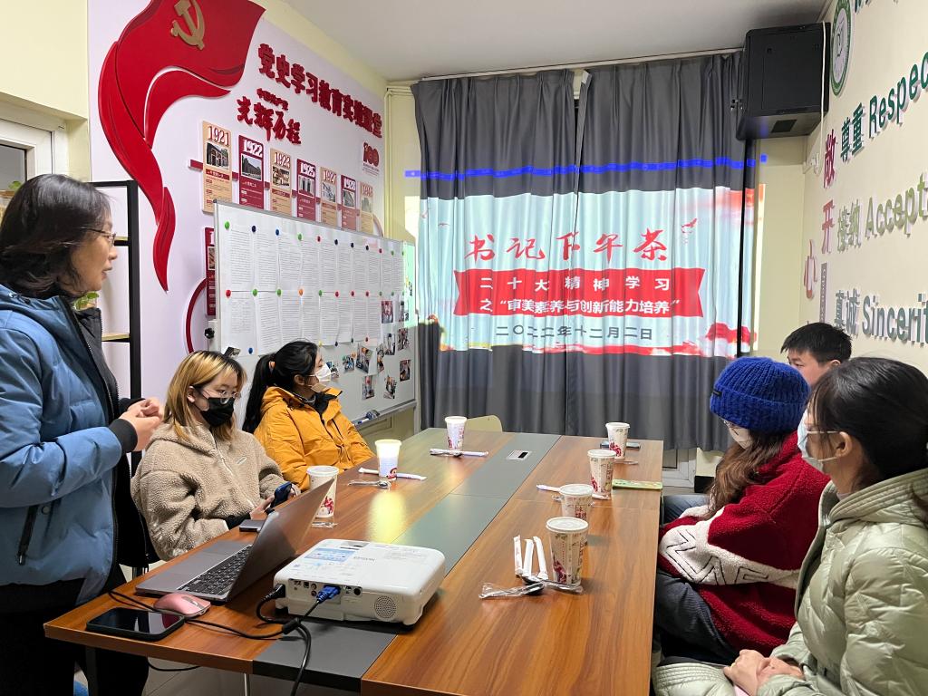 李骏书记以“审美素养与创新能力培养”为题带领学生代表们进行党的二十大精神的学习。她从党的二十大报告中关于“创新”的阐述与要求谈起,追溯“什么是创新”“什么是创新型人才”,从英语词源学视角探索了“创新”的内涵。继而,就“如何培养创新能力”这一问题,李骏书记从艺术与创新能力两者之间的关系谈起,结合生动的案例、真实的调研数据,分析了艺术培养创新能力的原因与路径。她倡导同学们培养丰富的审美想象、激发独特的审美情感、形成正确的审美观点,以此不断练就自身的创新能力。