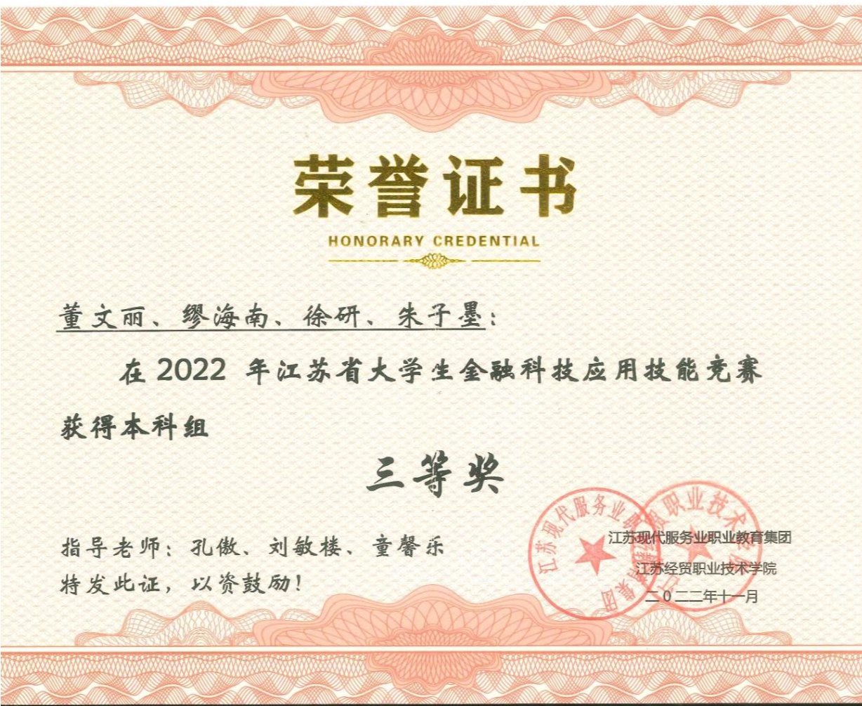 近日,由江苏省高等教育学会指导、江苏经贸职业技术学院主办、北京知链科技有限公司承办的2022年一带一路暨金砖国家技能发展与技术创新大赛金融科技综合能力赛江苏地区选拔赛圆满落幕。来自江苏省的48所高校的51支代表队,近300位同学参加了此次竞赛。金年会金融学院学子荣获省赛三等奖。