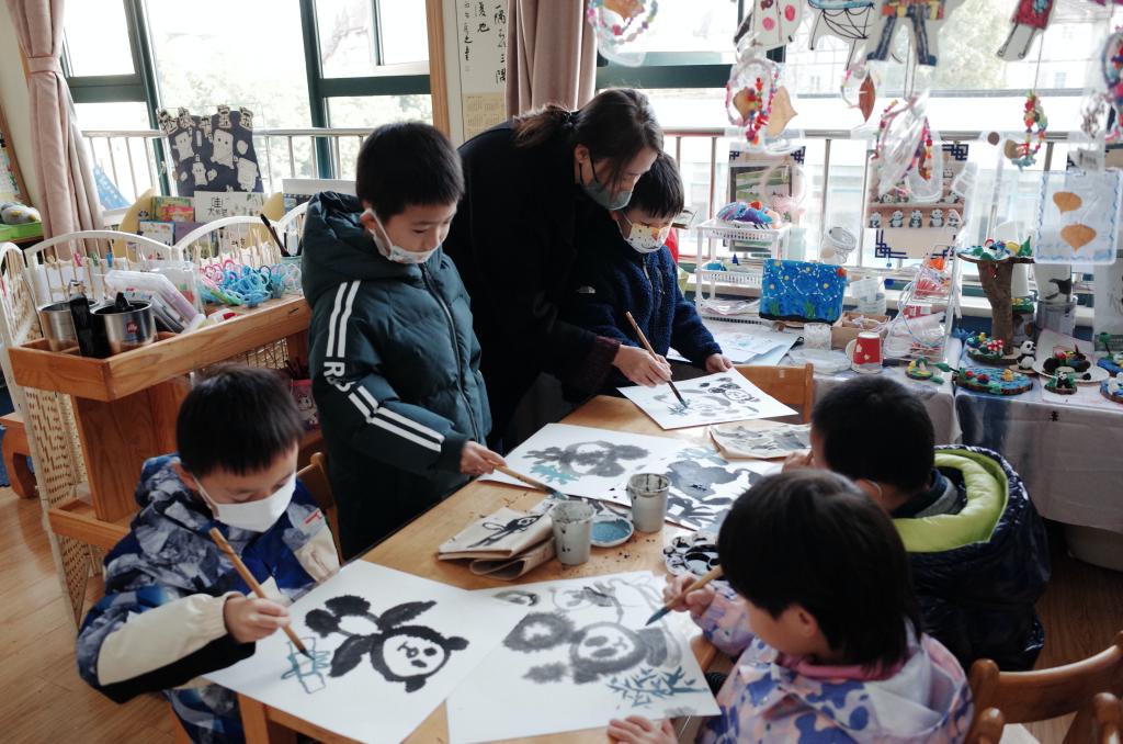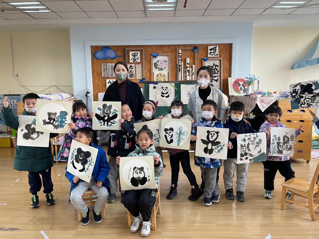 随后,每个小朋友都得到一支毛笔和画纸,大家根据程飞飞老师教的画法和构图,一笔一画地勾勒出自己心中大熊猫的样子,在自由创作中感受国画的美。