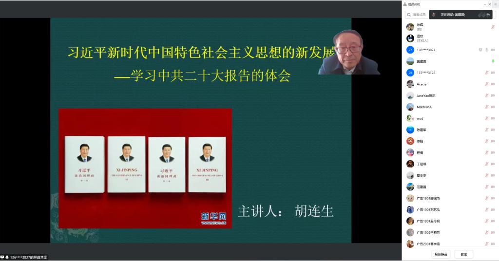 为深入贯彻党的二十大精神,推进党的二十大精神在全体党员中入心入脑、落地落实,12月14日下午,应营销与物流管理学院邀请,学校“五老”讲师团成员、马克思主义学院原院长胡连生教授以“习近平新时代中国特色社会主义思想的新发展”为主题线上进行了党的二十大精神宣讲。宣讲由学院党委书记黄建国主持。
