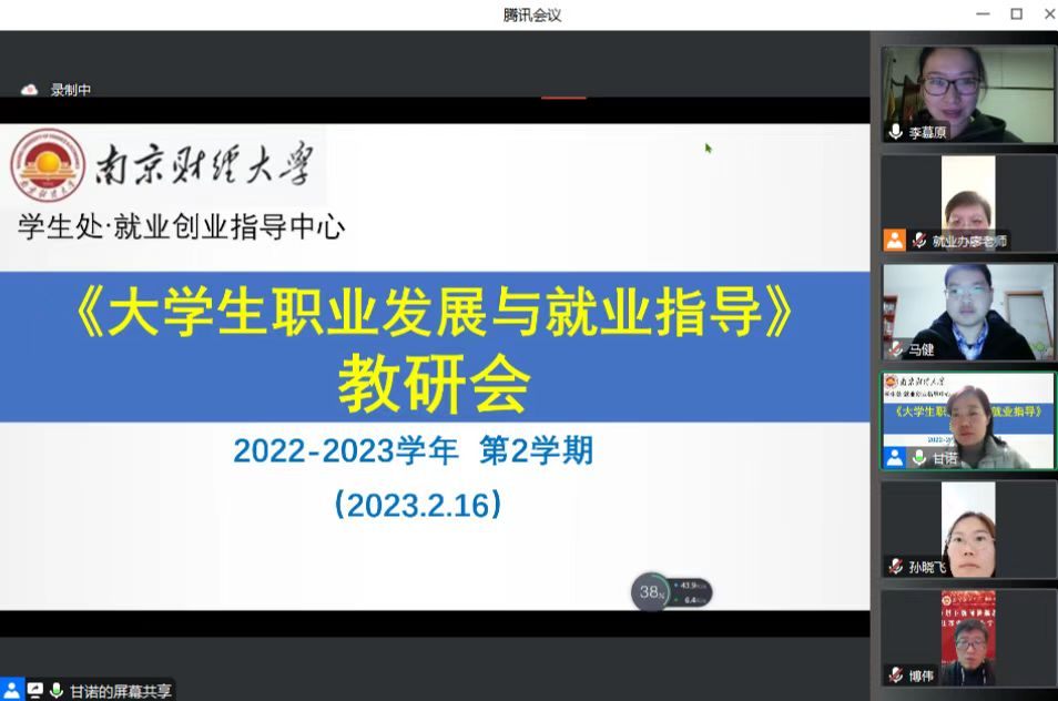 为进一步加强课程建设,提高授课质量,提升学生生涯发展能力和就业能力,促进学生全面发展,2月16日晚,学生处组织召开2022-2023学年第二学期“大学生职业发展与就业指导”课程教学线上研讨会,省就业创业培训专项导师、金年会法学院副教授甘诺作教学研讨辅导。课程全体任课教师参加研讨。研讨会由学生处副处长、大学生就业创业指导中心主任李慕原主持。