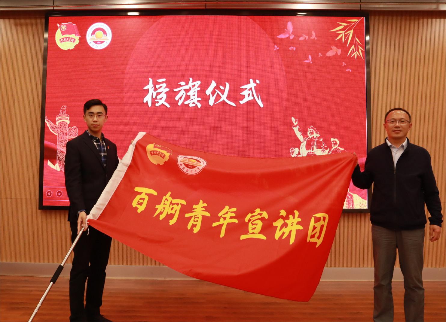 为进一步发挥团干部的示范引领作用,校团委创新组建了“百舸青年宣讲团”,选拔校级学生组织骨干、学院团学骨干,面向全校青年以青春分享、视频展播等多种形式开展宣讲活动。比赛现场,秦韶华副部长为“百舸青年宣讲团”授旗,新闻2001班马驭同学代表青年宣讲团上台接受授旗。