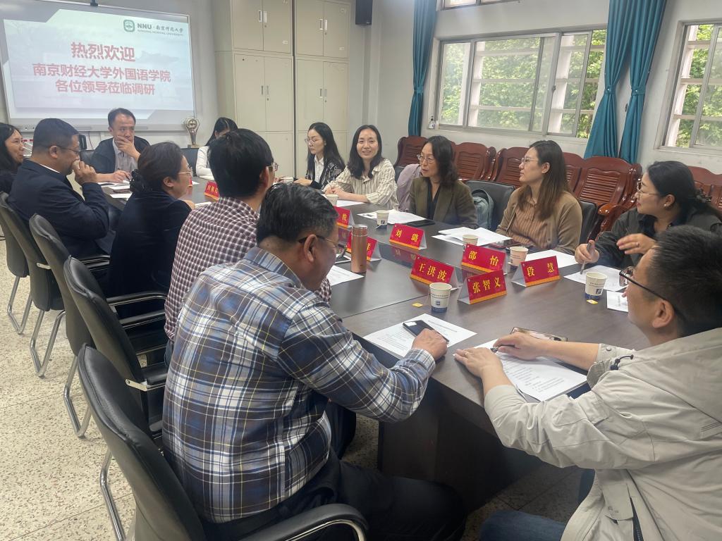 同行视角体现外语担当。5月6日,外国语学院党委书记李骏、党委副书记刘璐一行7人前往南京师范大学外国语学院进行调研学习。双方就党建与业务的深度融合策略、高水平大学建设中的外语人担当、深化产学研合作促就业对策、辅导员能力提升战略、人才培养方案修订、国际交流以及财力建设、青年教师的学术能力培养等7个方面进行了深度交流。双方就如何在学习贯彻习近平新时代中国特色社会主义思想主题教育中发挥外语优势,展示外语担当进行了热烈研讨。双方达成“跨校联动办专业”的初步意向,共同致力于创新新文科背景下外语发展的路径。