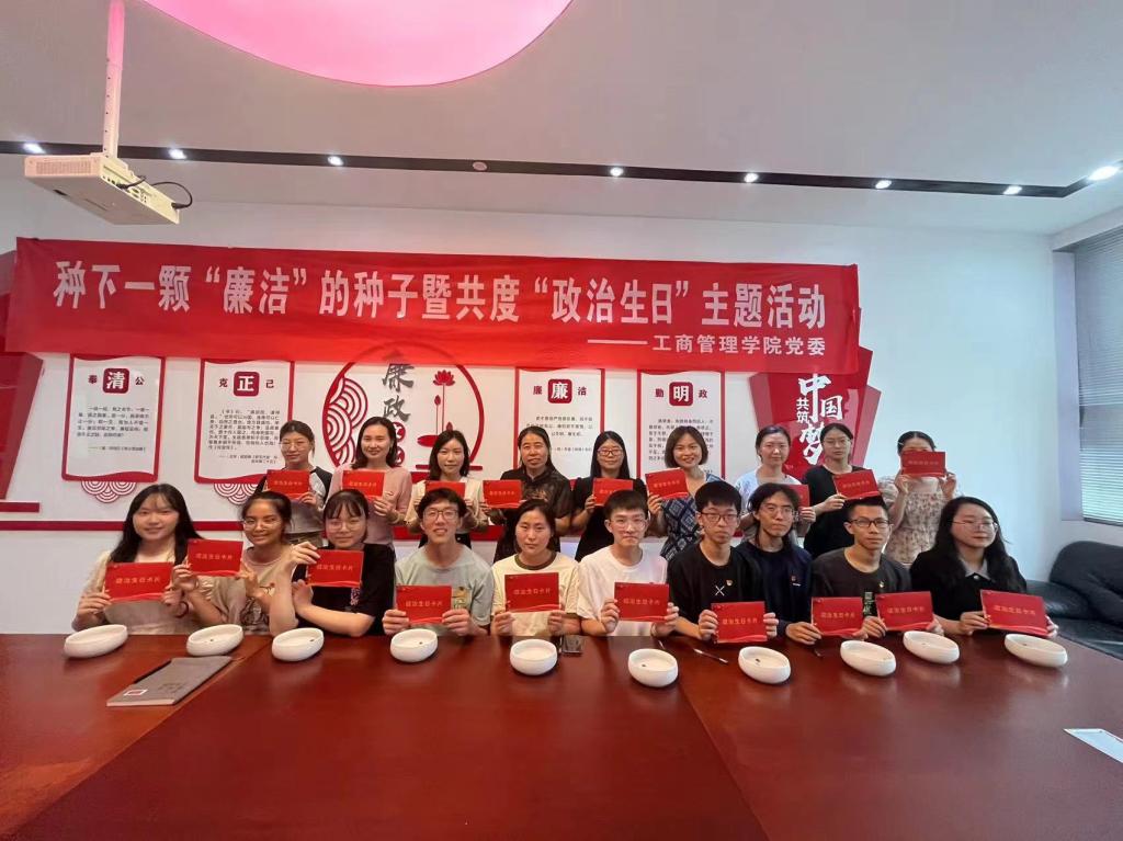 工商管理学院党委在德济楼403会议室开展了“种下一颗‘廉洁’的种子暨共度‘政治生日’”主题活动。工商管理学院领导班子成员、学工人员以及学生党员代表参加活动。师生们通过观看廉洁文化微电影《一念半生》感受清正廉洁的价值理念。随后,学院党委书记张杰与学生党员代表们一同播下“廉洁”的种子,让碗莲在纯洁的清水中发芽开花,引导同学们深入领悟廉洁的内涵,加深同学们对廉洁教育的感悟。随后,党员们笔墨传情,创作了“政治生日”卡片,互相交换,分享祝福,表达对党的敬仰和美好祝愿。最后,大家通过重温入党誓词,接受党性的洗礼。