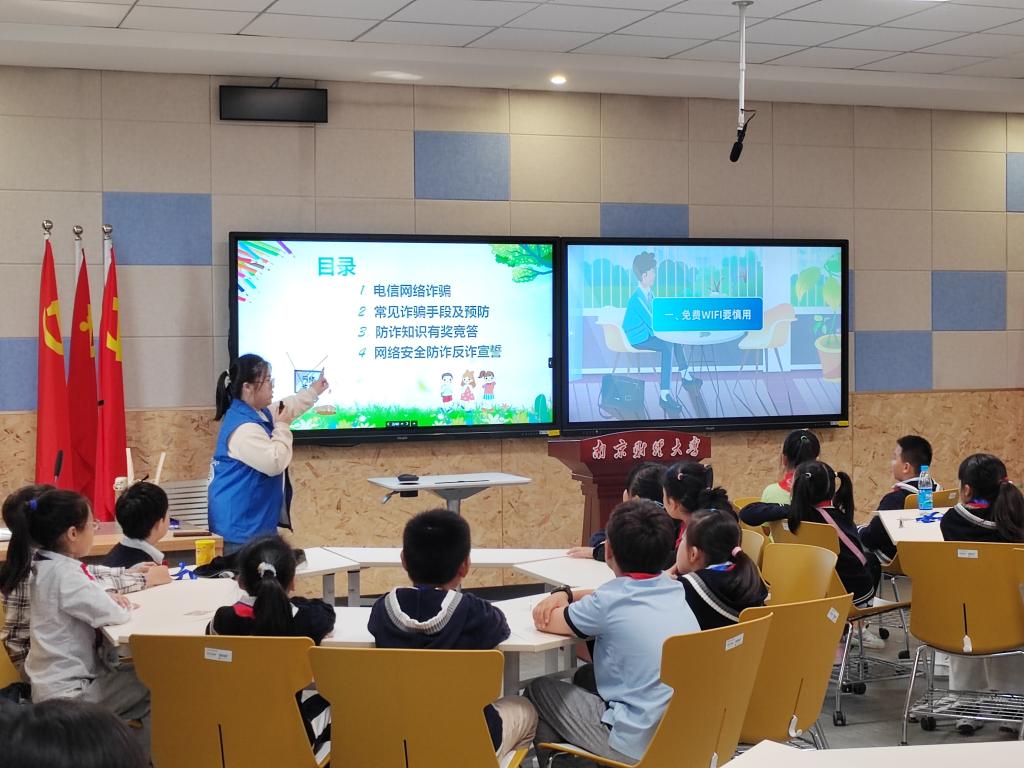信息工程学院携手南师附中仙林学校小学部南邮分校开展“小满课堂”之行走高校活动,南师附中仙林学校小学部南邮分校四(5)班32位学生及其家长来到金年会开启一趟特殊的研学旅行,体验大学生活,感受大学文化氛围。学院开展了“防网络诈骗,筑安全防线”主题宣讲课,主持人薛怡宁以小朋友们日常使用网络的情况引入话题,结合现实案例和宣传视频,普及网络安全知识,提醒小朋友们培养防范意识,同时结合专业特色,带领小朋友们识破网络诈骗手段。为检验知识吸收程度,现场进行了网络安全知识竞赛。最后,全体小朋友在主持人的带领下宣誓,提高网络安全意识,维护网络文明规范。