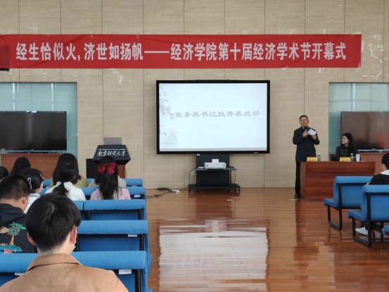 张圣兵书记致辞。他表示,经济学不仅是一门学科,更是一种理解世界、改变世界的工具,蕴含着独特的思维方式和生活态度。一直以来,经济学院致力于搭建多层次的学习与交流平台,培养具有创新精神、实践能力和竞争意识的复合型人才,注重通过实践活动提升学生综合素质。他建议同学们积极参与经济学术节系列活动,共同探讨经济学领域的热点问题,进一步加深对经济学的认识,展现金年会学子的特色和风采。