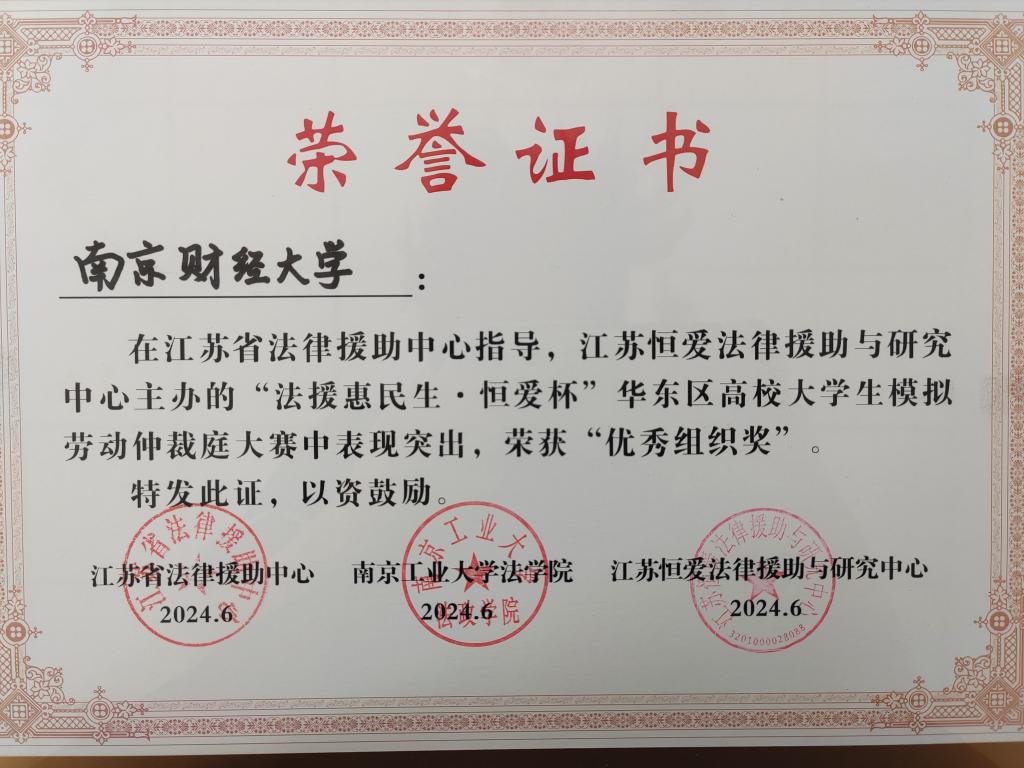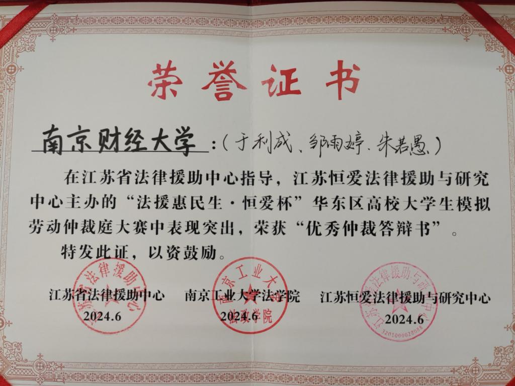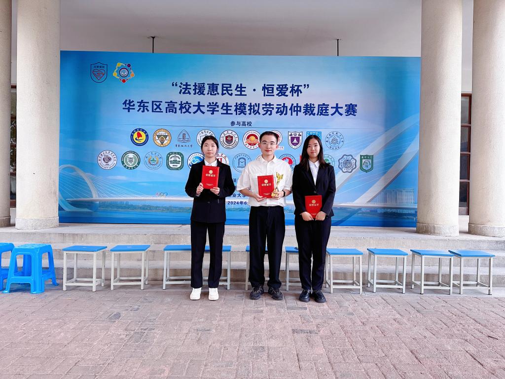 近日,第二届“法援惠民生·恒爱杯”华东区高校大学生模拟劳动仲裁庭大赛决赛在南京工业大学举办。金年会由汪华亮老师指导,邹雨婷、于利成、朱若愚组成的被申请人代表队经过激烈角逐,获“被申请人队”季军,提交的仲裁答辩书获评“优秀仲裁答辩书”,金年会荣获“优秀组织奖”。