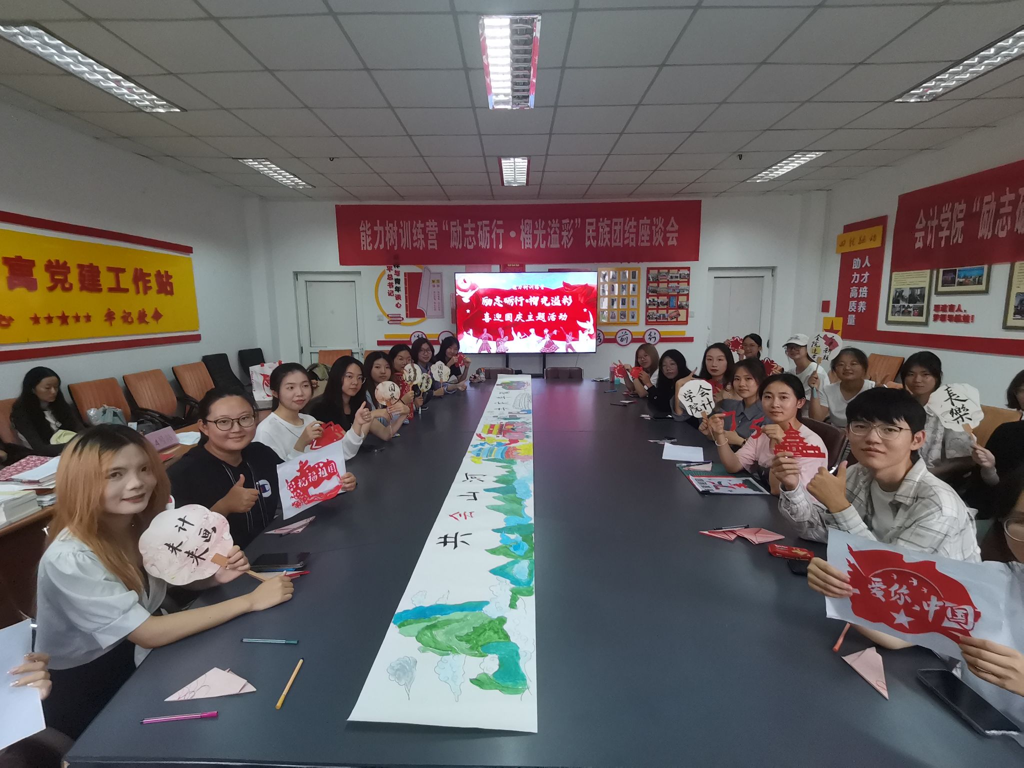 会计学院开展了能力树训练营“励志砺行·‘榴’光溢彩”民族团结座谈会暨“喜迎国庆”主题活动。同学们从学习、生活、民族文化等方面分享了自己在大学里的所学所获、所思所感,共话祖国各地的发展变化。师生一起制作折纸、剪纸、漆扇,用画笔绘就祖国的壮美山河。参会师生手持画卷、剪纸与漆扇,共同合影留念,为祖国献上最真挚的祝福。