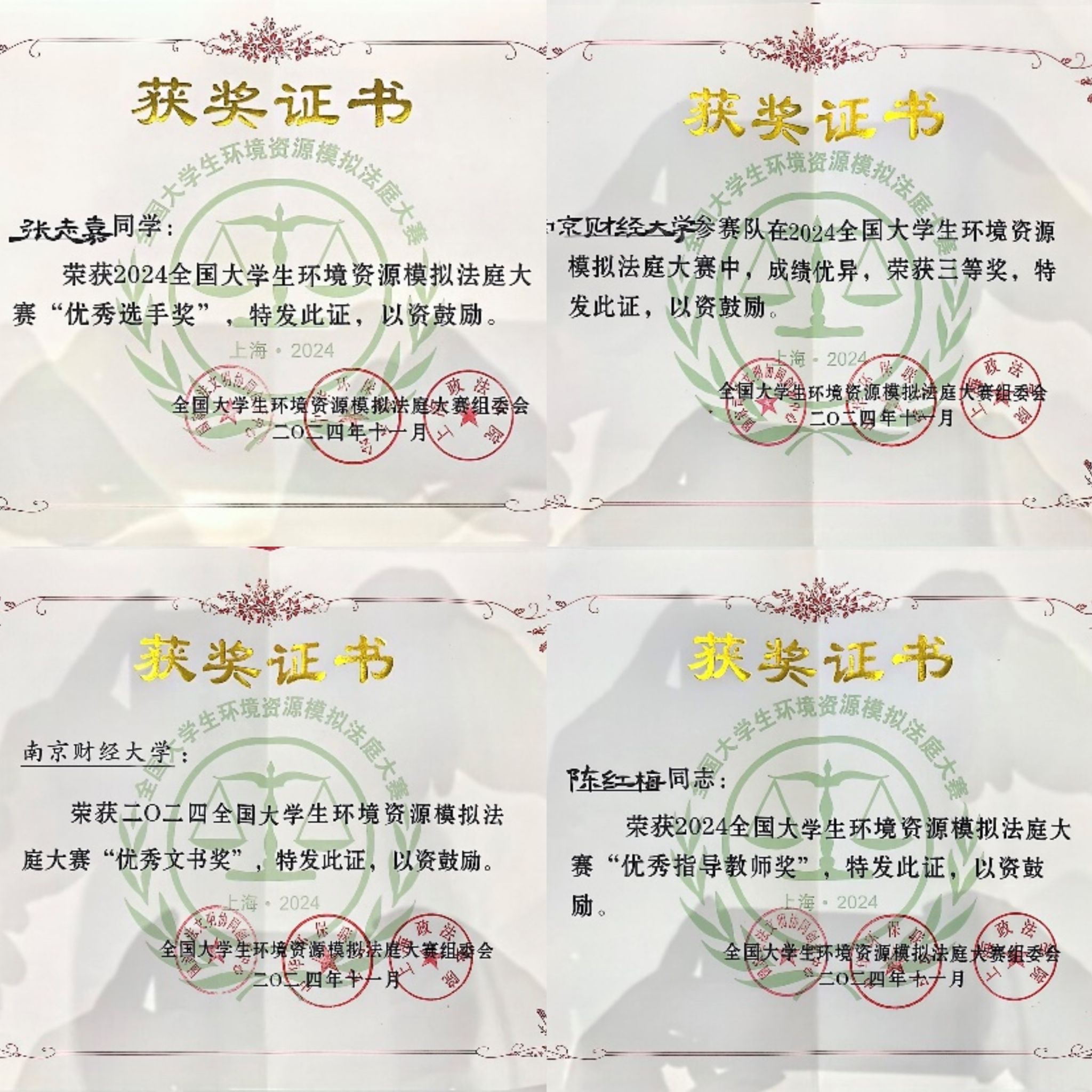 11月9日至10日,由最高人民法院环境资源司法研究中心指导,国家“2011计划”司法文明协同创新中心、中华环保联合会、上海政法学院主办,上海政法学院经济法学院、中国—上海合作组织国际司法交流合作培训基地承办,中华环境保护基金会、上海弼兴律师事务所协办的2024全国大学生环境资源模拟法庭大赛在上海政法学院举行。由法学院陈颖(队长)、张志嘉、邹雨婷、刘清、郭晓、郭友荣等6名同学组成的参赛队伍,经过激烈角逐,获全国三等奖和“优秀文书奖”,指导老师陈红梅教授获“优秀指导教师奖”,张志嘉同学获“优秀选手奖”。