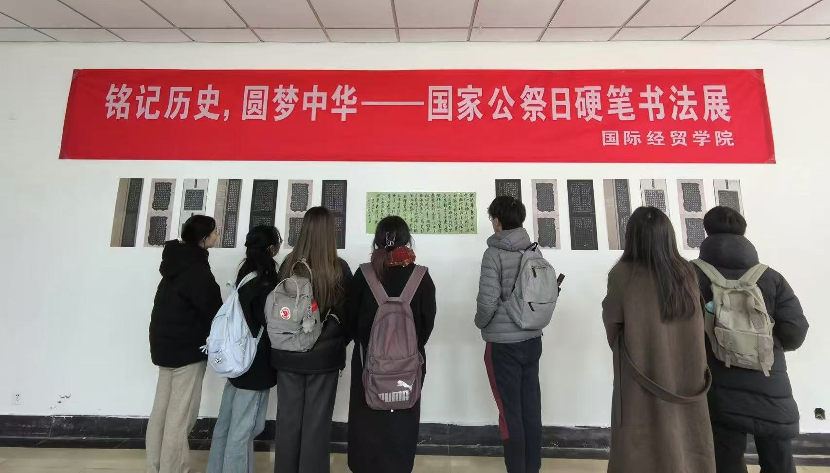 国际经贸学院学子身着黑色服装,胸戴白花,集体朗诵国家公祭鼎铭文并举行庄严肃穆的默哀仪式,寄托对遇难同胞的缅怀之情。举办国家公祭日硬笔书法展,展出24幅书法作品,同学们将对遇难同胞的哀悼、对和平的珍视、对未来的憧憬,倾注在笔墨之中。学院各团支部开展“铭记历史,圆梦中华”主题团课,系统学习《中华人民共和国爱国主义教育法》和《南京市国家公祭保障条例》,深刻理解爱国主义精神的丰富内涵,增强国家意识和集体观念,争做民族复兴大任的时代新人。