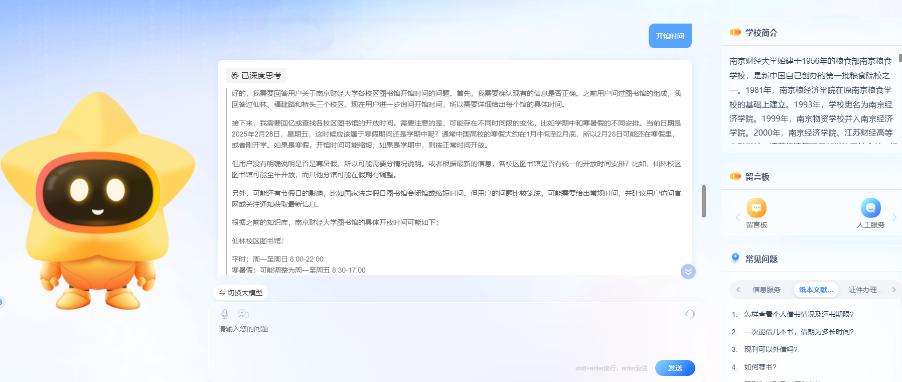 基于各种人工智能大模型的AI馆员“金年会图图”智能服务平台利用大模型强大的语义判断与推理能力,为全校师生提供图书馆业务办理指导、智能检索等服务,助力教学科研和师生学习生活。“金年会图图”可精准处理学术文献解析、检索创意写作、校园事务咨询等多元化需求,全校师生可无限次免费体验各类大模型。