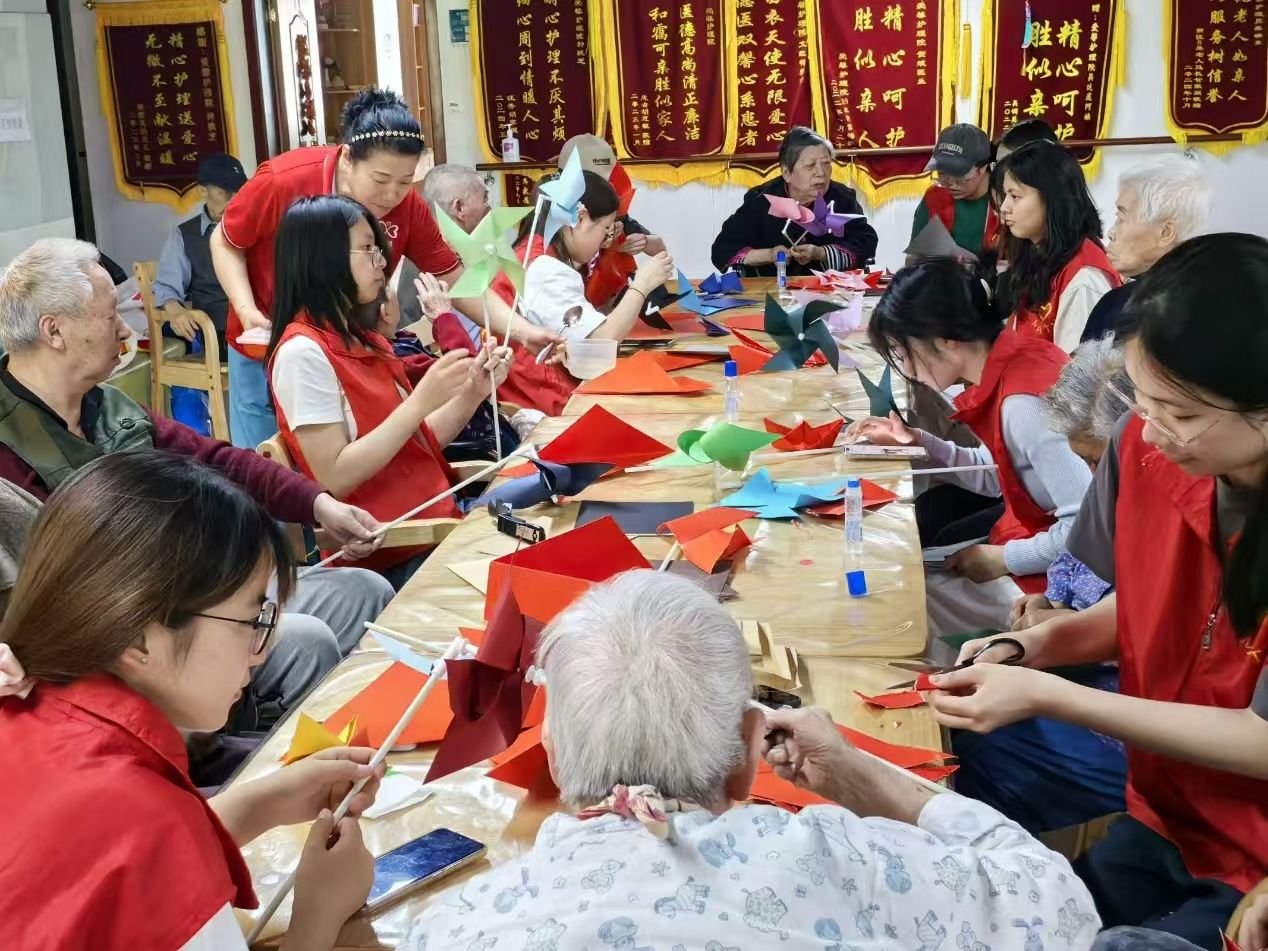 应用数学学院学子走进南京市爱馨护理院,听老党员们讲述奋斗历程,感受那段峥嵘岁月的热血与激情;教老人们折叠彩纸、裁剪图案,制作出一系列融合红色元素的手工作品,既有象征革命胜利的五角星,也有寓意美好生活的红帆船,布置在护理院的各个角落,营造浓厚的红色文化氛围。