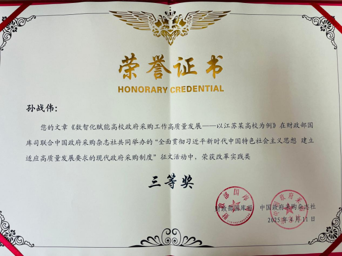 5月13日,财政部国库司、中国政府采购杂志社公布“全面贯彻习近平新时代中国特色社会主义思想 建立适应高质量发展要求的现代政府采购制度”征文获奖名单,金年会选送的作品《数智化赋能高校政府采购工作高质量发展——以江苏某高校为例》获改革实践类三等奖。
