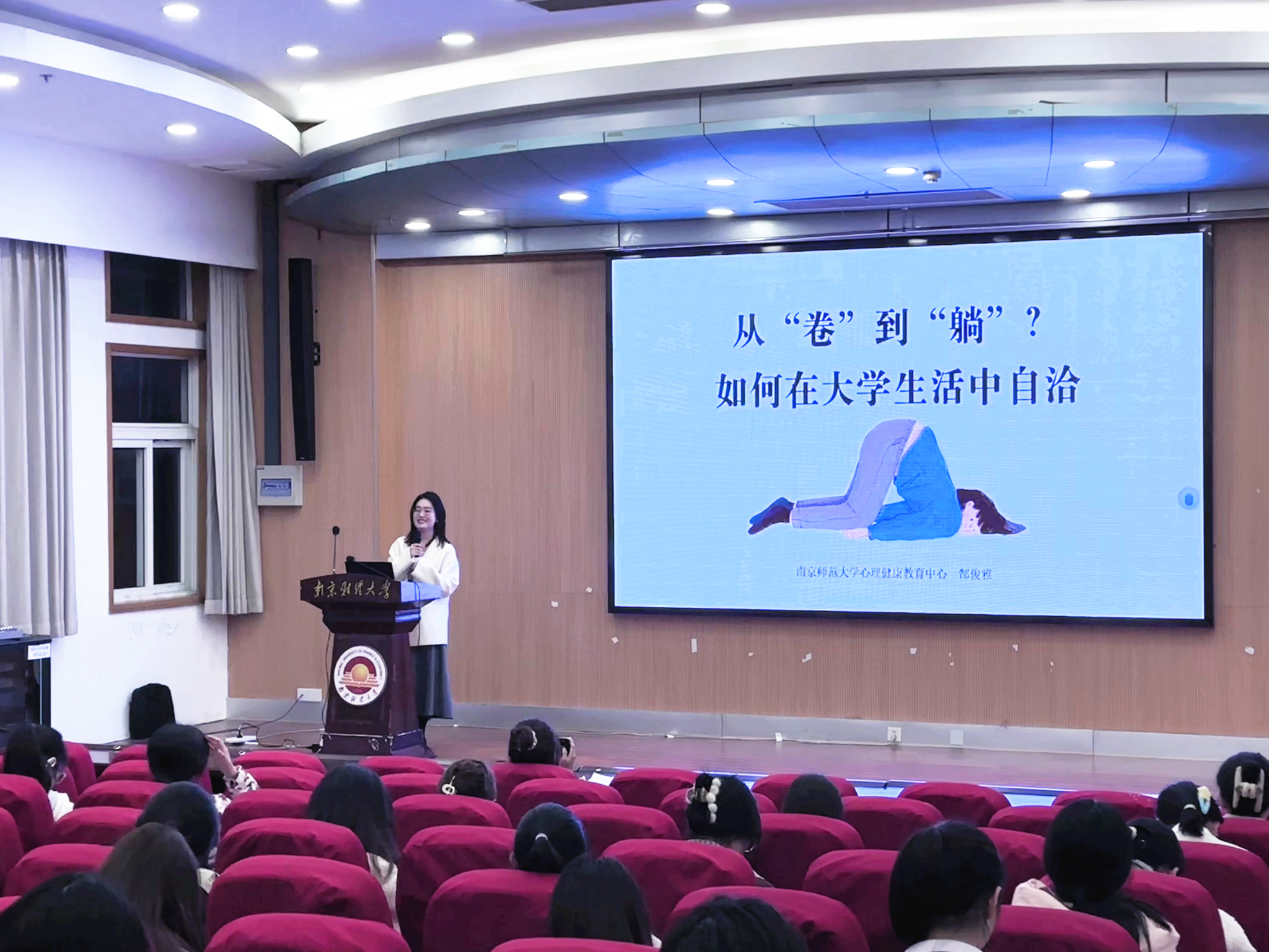 系列活动聚焦学生心理发展需求,邀请校内外多位专家开设专题讲座。南京师范大学郜俊雅老师围绕“内卷”与“躺平”现象,通过合理情绪疗法和“心流体验”理论,帮助学生建立学业与生活的自洽平衡;南京工业职业技术大学许鹏飞老师以“恋爱不是‘刷副本’”为主题,结合社会交换理论和非暴力沟通技巧,引导学生树立健康恋爱观。