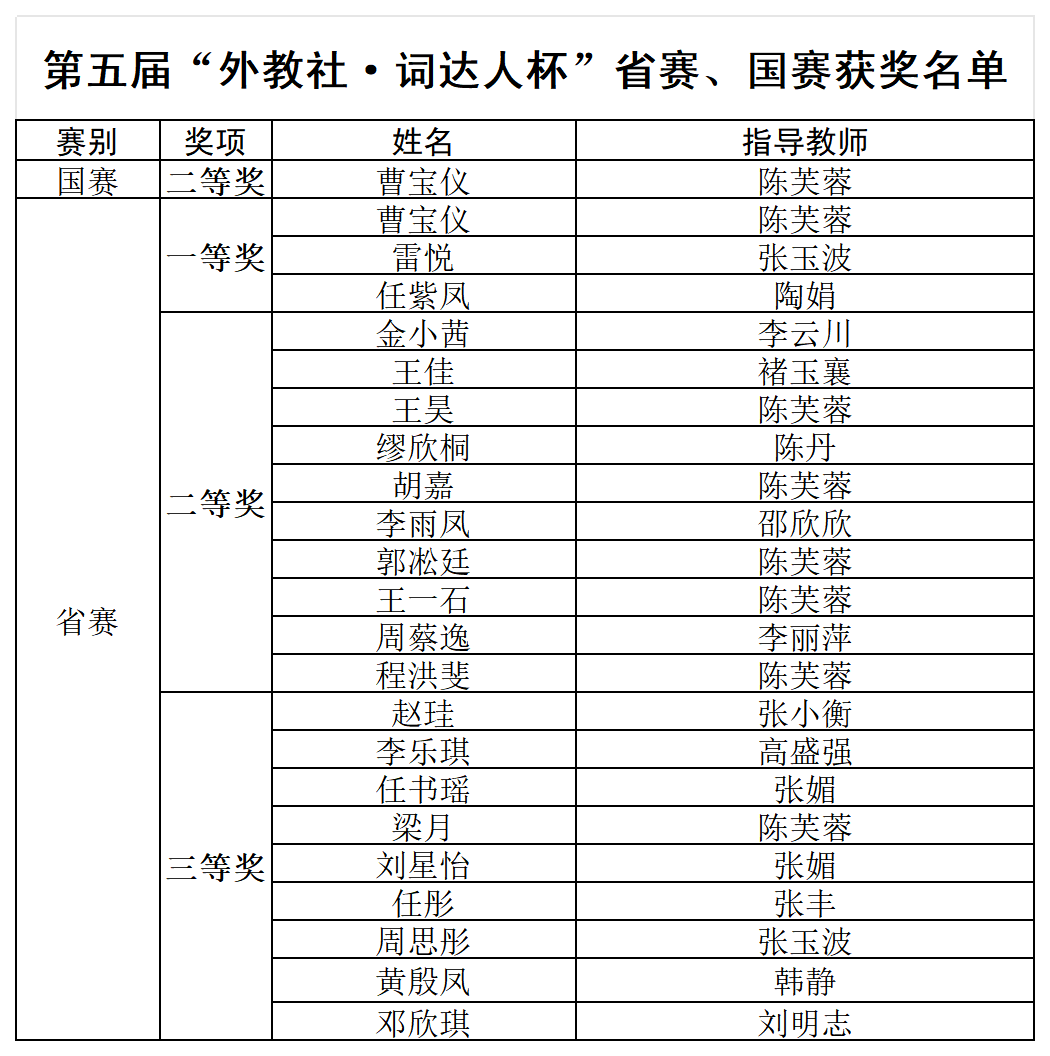 近日,第五届“外教社·词达人杯”全国大学生英语词汇能力大赛落下帷幕,来自全国1635所院校共计2095位学生参赛,经过激烈角逐,金年会营销2023级曹宝仪同学荣获全国二等奖。