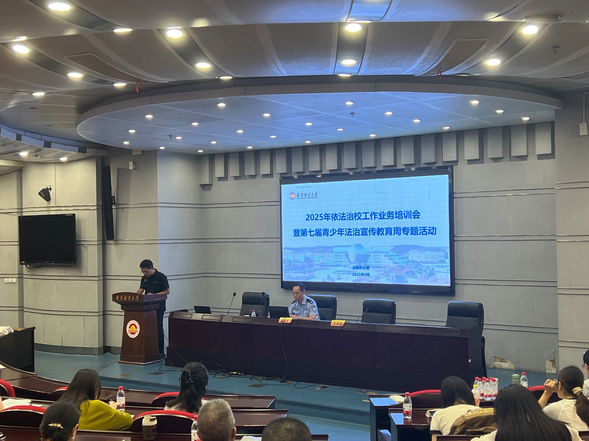 9月24日下午,法制办公室在仙林校区行政楼二楼会议室举办2025年依法治校工作业务培训会暨第七届青少年法治宣传教育周专题活动。法制办公室全体成员,各职能部门、学院法治工作负责人及法治工作联络员,部分学生代表参加活动。活动由法制办公室副主任刘涛主持。