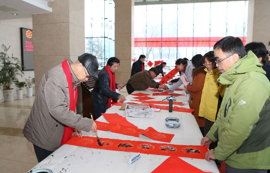 1月9日中午,工科楼张灯结彩,翰墨飘香。由外国语学院党委书记刘浩拟就、艺术设计学院教授仇高驰书写的励志对联“自谦自信怀揣富国兴邦之志,务实超越炼就经世济民之才”贴在门首;寓意吉祥的中国结喜气洋洋地挂在门的两旁。虽然屋外雪花纷纷,现场却暖意浓浓。由校工会主办、教职工书画摄影协会协办的“寒冬送春暖,墨香暖人心”——迎新春、送春联活动暖心举行。