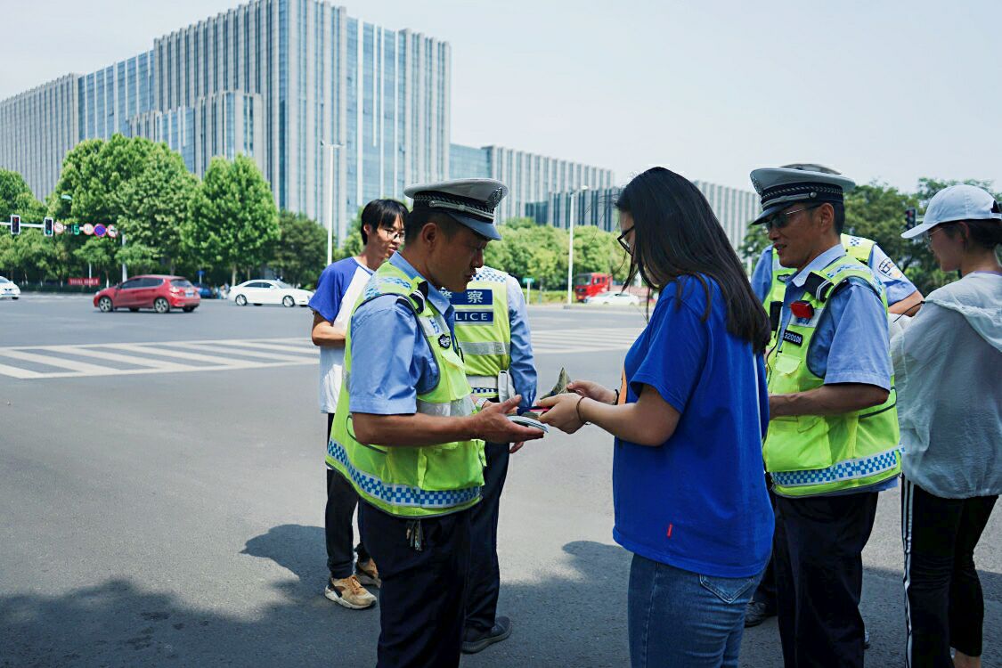 在北苑十四号宿管站,宿管员王根燕阿姨接过承载着同学们祝福的贺卡和香包高兴地说:“收到同学们送来的端午香包和贺卡,真是太感动了。今年端午节,子女们因为工作都不回来过节,本来还是有点失落的,但是现在想想有这群朝夕相处的同学们陪我们过节,同样是幸福的。”在文苑路与学海路交叉路口,同学们将风油精、香包等送到了正在执勤的交警手上,感谢他们为城市交通安全付出的辛勤劳动,交警们在收下同学们的爱心时,也纷纷为大家的爱心举措点赞。