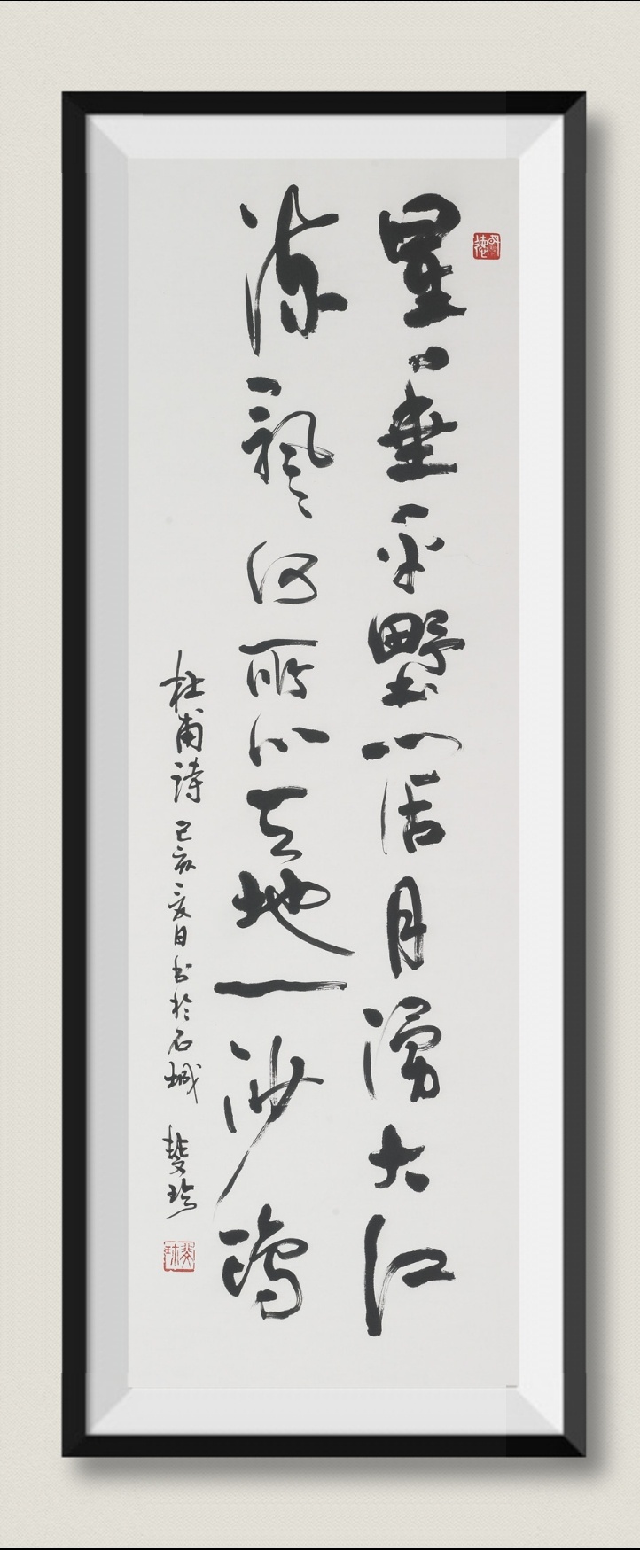 仇高驰教授的书法作品《至化与人同乐,大和随地皆春》,寓意天下大和、向善同乐、四处皆春;蒋平老师的书法作品内容“星垂平野阔、月涌大江流,飘飘何所似、天地一沙鸥”取自杜甫的《旅夜书怀》,篆刻作品以“明德”居首,寓意弘扬正气国风。两位老师的作品以其深刻的艺术性、鲜明的主题性,表达了身处国泰民安新时代的喜悦之情和感恩之念。