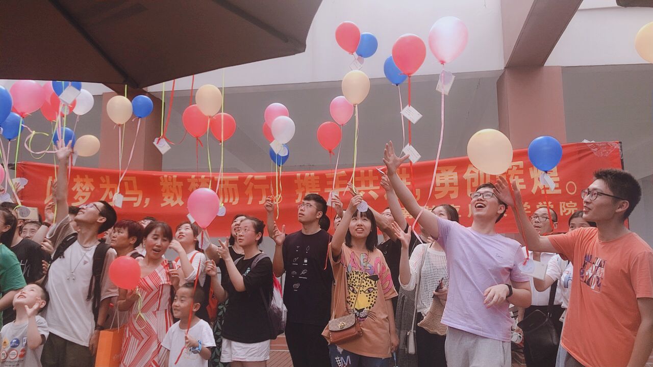 应用数学学院举办了“开启大学之门小欢喜,放飞青春梦想大未来”放飞气球活动,活动在悠扬的乐声中开始,家长和新生在草坪集合,精心挑选五颜六色的梦想气球,气氛一片欢乐祥和。新生们拿着气球许下对大学四年及未来的愿望,用记号笔满怀希望地将梦想写在系着气球的卡片上。当色彩缤纷的气球一个一个飞上天空的瞬间,天空仿佛被孩子们的梦想装点。