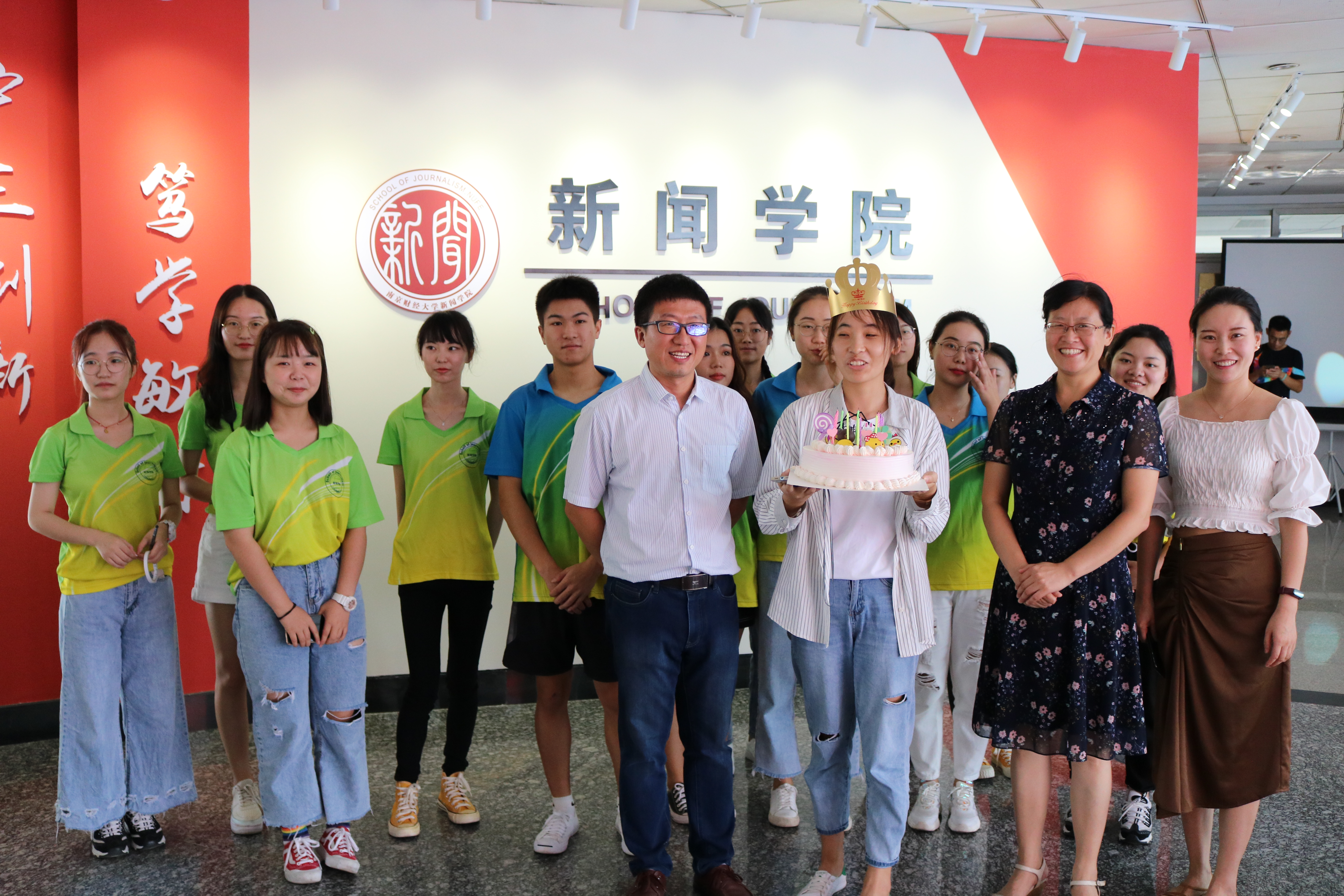新闻学院采用了现场直播的形式,新生从宿舍出来之后,便由站点的志愿者安排采访,拍摄视频,视频直接放映在报到处的大屏幕上。新生到达报到处的时候,就可以看到自己和家长的采访视频。网媒1901的张凌禹同学表示,“虽然有点尴尬,但是还是很开心很惊喜。而且对于自己专业有关的内容好像有了一点了解,甚至还会有点莫名的骄傲。”在直播连线的间隙,大屏幕循环放映新闻学院历届学生的优秀视频作品和他们对新生的寄语,鼓励新生在大学的舞台上充分展现自己。学院还为今天过生日的新生准备了生日蛋糕和生日祝福。