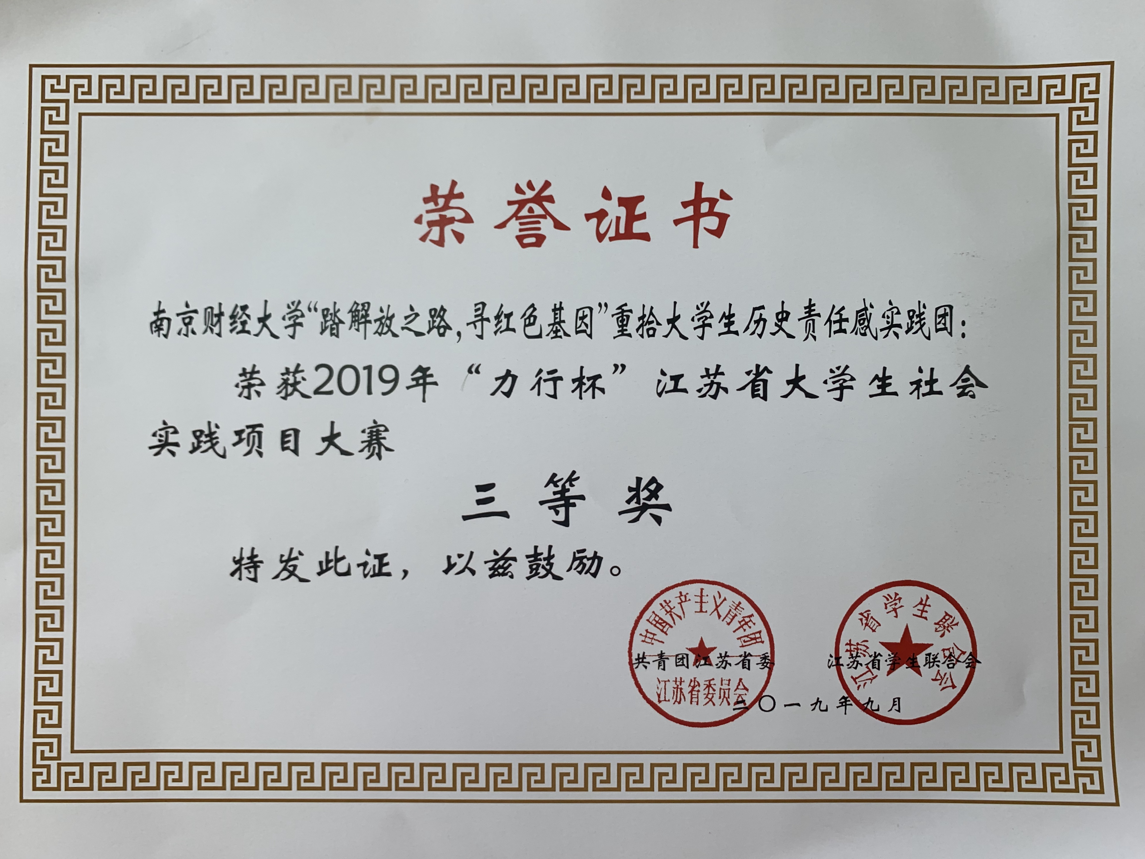 近日,共青团江苏省委下发《关于2019年“力行杯”江苏省大学生社会实践项目大赛的表彰决定》(团苏委联[2019]19号),金年会会计学院“少数民族大学生双语宣传阿克苏实践团”荣获二等奖,国际经贸学院“‘踏解放之路,寻红色基因’重拾大学生历史责任感实践团”荣获三等奖。