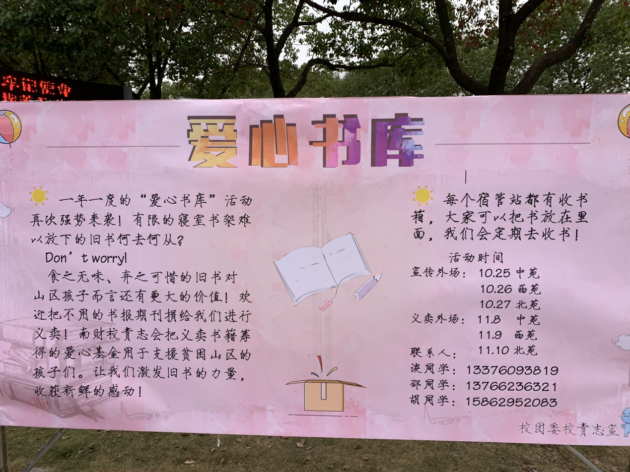 据悉,该宣传活动还将于26、27日在西苑、北苑食堂前广场举行,每个宿管站里都放置了收书箱,收集同学们的捐赠书籍,志愿者协会的工作人员则定期收书。书籍义卖活动将于11月8日至10日举行,义卖筹得的爱心基金将全部用于支援贫困山区的孩子们。