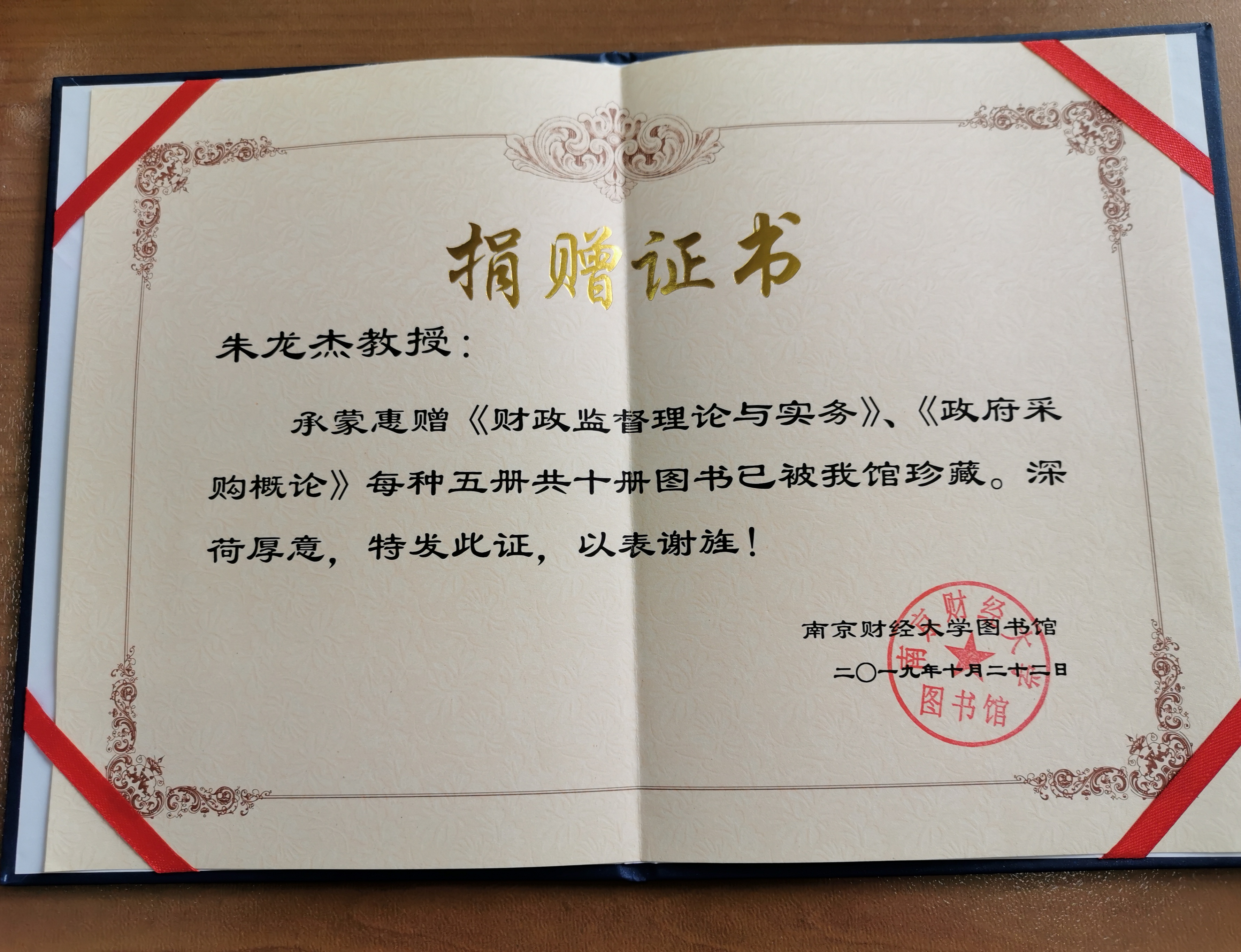 10月22日,民建金年会大基层委员会朱龙杰主委向校图书馆捐赠他本人近五年撰写的两部著作:《财政监督理论与实务》(江苏科技出版社2015年8月出版)和《政府采购概论》(东南大学出版社2018年6月出版),每部著作五册,共十册图书。校图书馆向朱龙杰主委颁发了捐赠证书。这也是朱主委第三次向学校图书馆捐赠他的个人作品。
