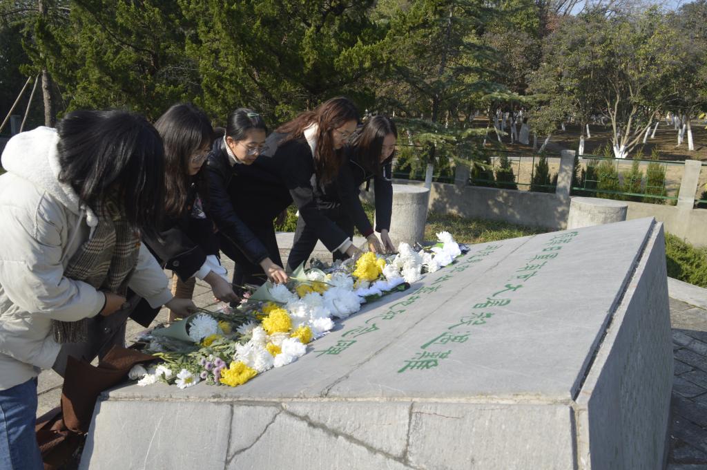 12月12日,国际经贸学院学生分别前往南京大屠杀清凉山遇难同胞纪念碑、中山码头遇难同胞纪念碑、北极阁附近遇难同胞纪念碑,在各纪念碑前举行了“寻找失落的纪念碑,祭忠骨亡灵”悼念活动。献纸花,贡黄菊,燃白蜡,默哀。在一片肃穆的氛围下,同学们庄严宣誓,以《公祭日和平宣言》展示出青年一代铭记历史,振国兴邦的决心。宣誓完毕,同学们将亲笔手工画“这盛世,如您所愿”放置在碑前。画作一笔一笔,由淡转浓,由浅入深,勾勒出新中国一路走来的印记,一幅幅图画将先烈同胞为之无悔奋斗、牺牲的盛世中国用画笔展现。画作作者戴泽宇表示:“画纸有限,祖国的成就无限,这是我们青年学生想用绘画形式向先烈们展示‘这盛世,如您所愿’”。晚上,他们聚集于图书馆前广场开展“烛光祭·缅胞魂”缅怀南京大屠杀遇难同胞活动,将蜡烛摆成“1937—2019”“南京”等形状,一簇簇跳动的火苗,仿佛将在场同学带回八十年前哀鸿遍野的岁月,卅万亡灵,饮恨江城。“从来不曾有什么岁月静好,是有人替我们负重前行。无数革命先烈前仆后继为今日的安稳和平献出了生命,历史有记忆,民族有记忆,吾辈当自强,永记金陵殇!”活动组织者国贸1702班潘美羽同学说完,和大家一起手捧蜡烛,默默哀悼,祈愿和平。