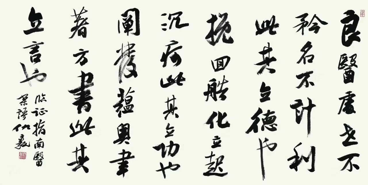仇高驰教授捐赠的作品里有选自唐代孙思邈《千金要方·大医精诚》的名句“至精至微,至意深心”,有清代叶天士《临证指南医案》的名句“良医处世,不矜名,不计利,此其立德也;挽回造化,立起沉疴,此其立功也;阐发蕴奥,聿著方书,此其立言也”,有唐代诗人王昌龄《送柴侍御》里的诗句“青山一道同云雨,明月何曾是两乡”,也有“众志成城”“医之为道,非精不能明其理,非博不能至其约”等作品,这些作品传递了仇高驰教授对武汉、对湖北的祝福,对奋战在抗疫一线的白衣勇士们的敬意,也体现了江苏文艺工作者的责任和担当。