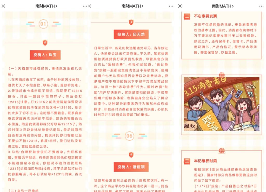 在国际消费者权益日来临之际,为了让同学们对这个特别的日子有更深的了解,增强消费者权益保护意识,3月8日至12日,应用数学学院开展了“3·15”线上投稿消费者权益小故事活动,并在3月13日将同学们的投稿以分享会的形式在学院公众号进行推送。
